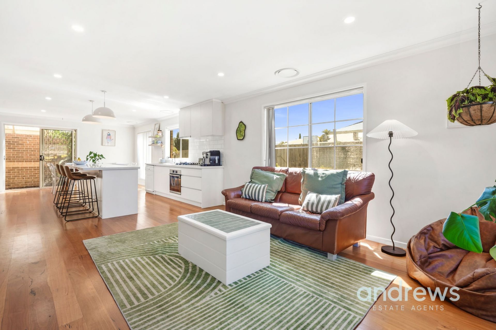 - Spacious open-plan lounge and dining area that flows seamlessly into a sleek modern kitchen complete with quality appliances and a large island bench.