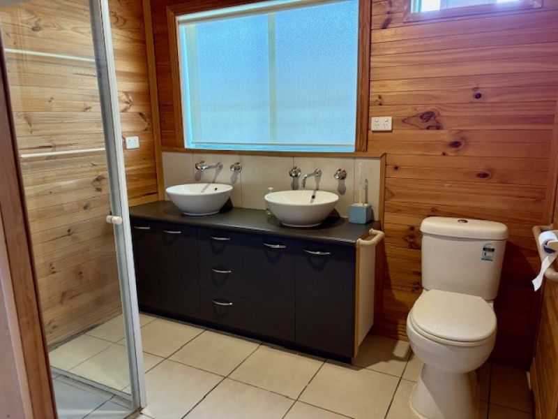 - Bathroom with double basin vanity, toilet and shower