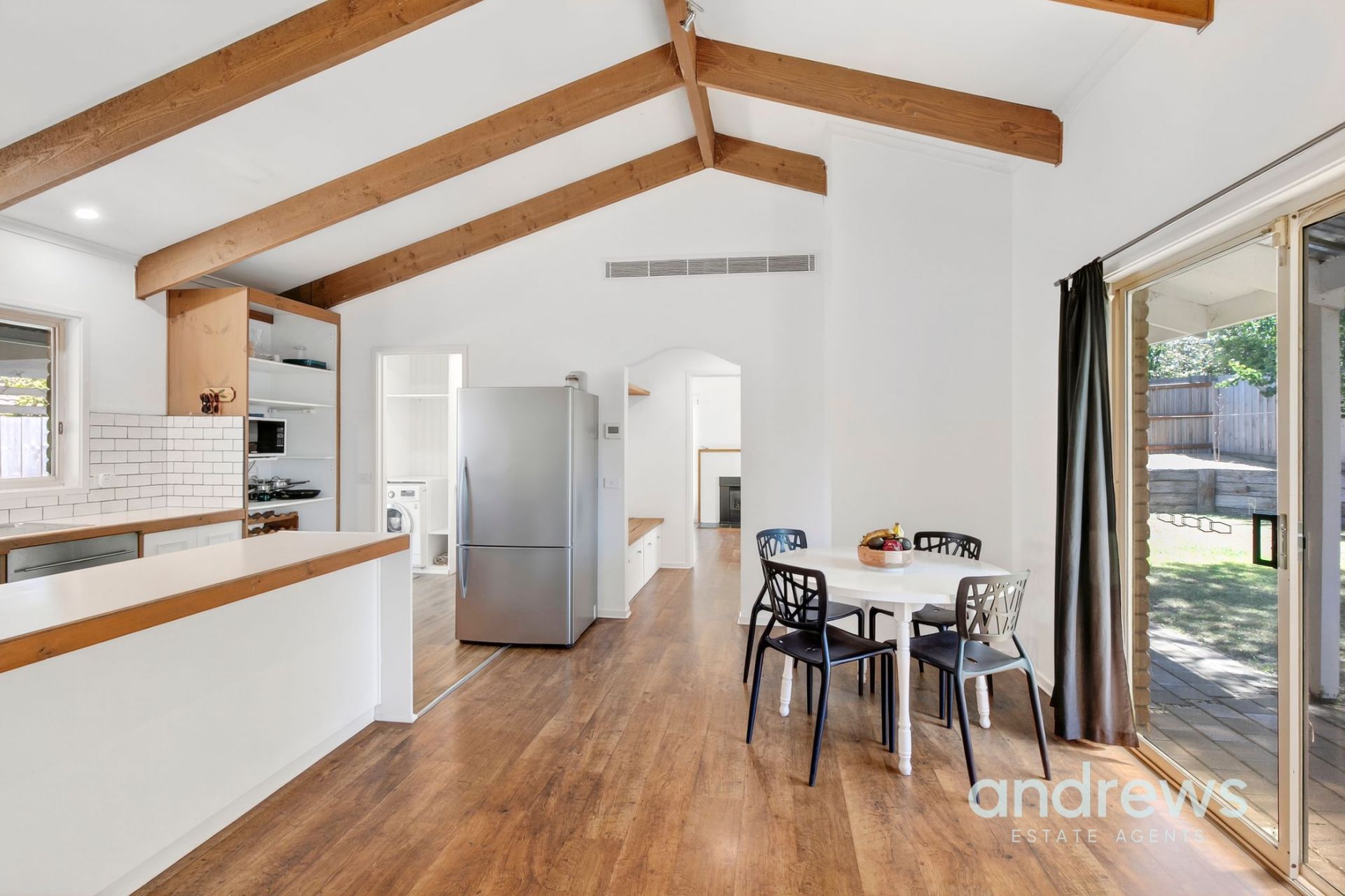 Enjoy sun-filled interiors with a relaxed, beachy aesthetic, complemented by a warm gas log fire for cooler months. With soaring ceilings and exposed beams the interior has a feeling of space and provides plenty of natural light.